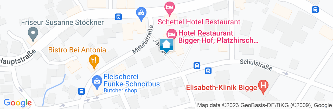 Der Bigger Hof befindet sich in zentraler, aber ruhiger Lage im Ortskern von Bigge. 50 m von einer Bushaltestelle, 300 m bis zum Bahnhof, 200 m zum RuhrtalRadweg. Das Restaurant im Hotel verfügt über 80 Sitzplätze und eine schöne Kaminecke, sowie über eine rustikale Braustube und einen Biergarten. Bundeskegelbahn, Garagen für Fahr- und Mottorräder, Werkstatt und Trockenräume, Geführte Motorradtouren, Geführte Wanderungen, Gepäcktransfer für "Wandern und Biken ohne Gepäck", Parkplatz (auch für Busse), Sky Sportsbar. Einzelzimmer, 12 Doppelzimmer, sowie 2 Dreibett-, 2 Vierbett- und 1 Sechsbett-Appartement.